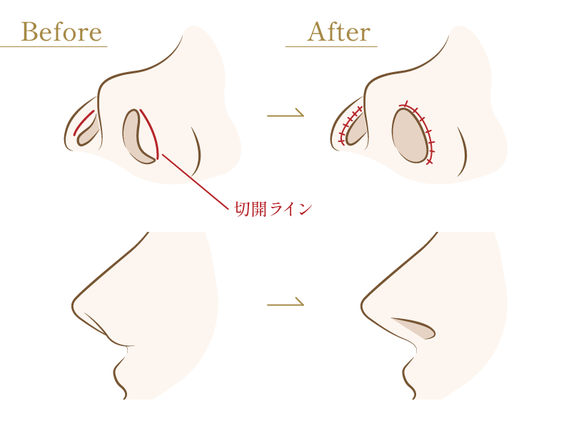 手術は麻酔を使用するため、術中の痛みはありません。術後の痛みも、処方する鎮痛剤でコントロール可能です。また、切開は鼻の穴の内側の縁に沿って行うため、お顔の表面に傷跡が残ることはなく、目立つ心配はありません。