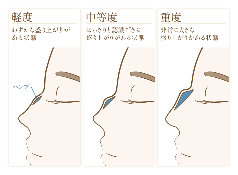 鷲鼻は、そのハンプの大きさによって、一般的に「軽度」「中等度」「重度」に分類され、それぞれアプローチが異なります。