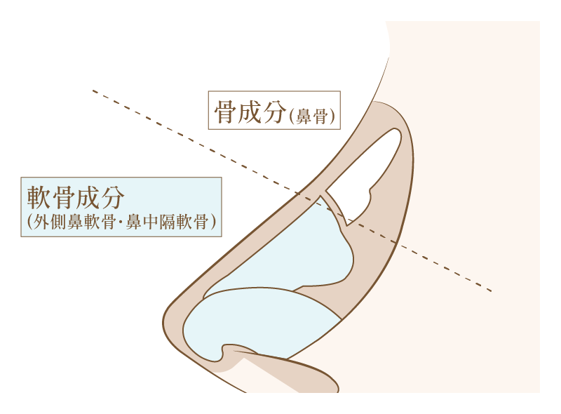 鷲鼻の原因を理解するためには、まず鼻の構造を知ることが重要です。鼻筋は、「上部の硬い骨」と、それより下の柔軟な「軟骨」(主に外側鼻軟骨と鼻中隔軟骨)の2つのパーツで構成されています。
