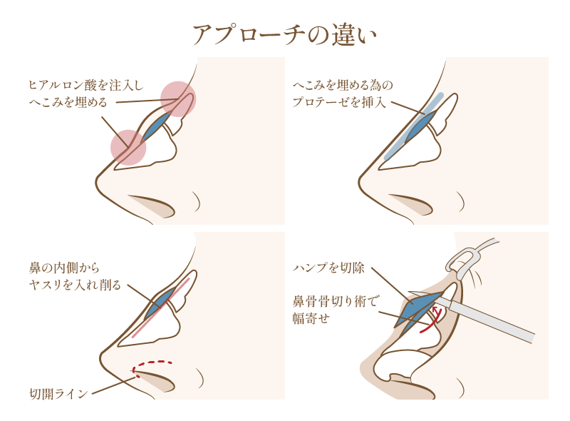 基本的に、鼻の穴の中から切開する「クローズ法」で行うため、お顔の表面に傷跡が残ることはありません。その小さな切開部から専門の医療器具を挿入し、盛り上がっている鼻骨を慎重に削り、軟骨部分を丁寧にトリミングして、鼻筋全体が滑らかになるよう整えていきます。