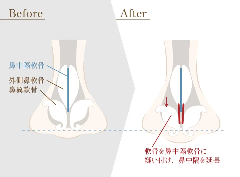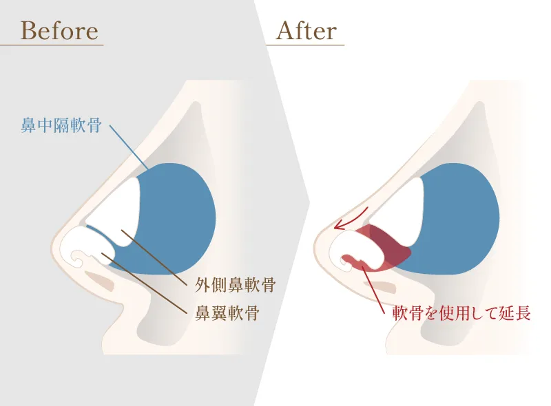 鼻の中心を支える”柱”である「鼻中隔軟骨」に、ご自身の軟骨(主に耳や肋骨の軟骨)を移植して延長し、鼻先の高さ・長さ・角度を理想の位置に形成する、鼻の土台を再構築する手術です。この強固な土台を作ることで、短い鼻を長くしたり、上向きの鼻を下向きにしたりと、これまで難しかったデザインを安定して実現できます。