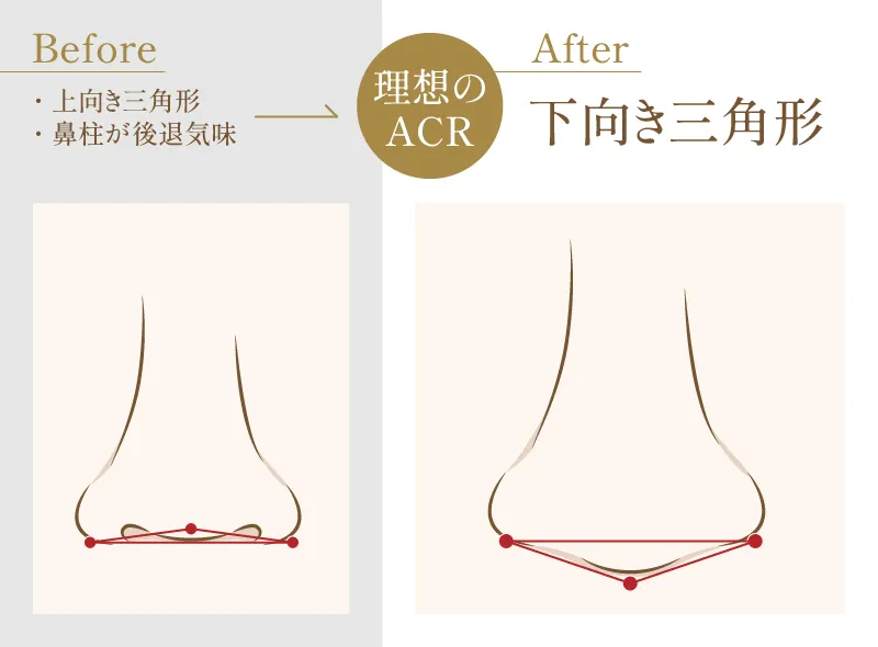 鼻中隔延長で鼻先が自然に下向きとなり、顔全体のバランスに調和した忘れ鼻を目指すことができます。鼻先のバランスはACR(Alar–Columellar Relationship)といって、「小鼻(Alar)」と「鼻柱(Columella)」の位置関係を示す指標です。ACRは時代によって流行りがありますが、鼻柱が小鼻よりわずかに下に見える状態がバランスが取れているとされています。
