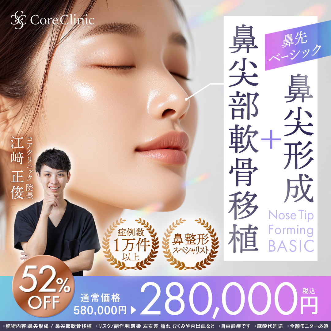 | 鼻先ベーシック 鼻尖形成+鼻尖部軟骨移植 | 330,000 円 | 280,000 円 |